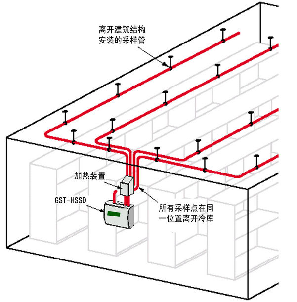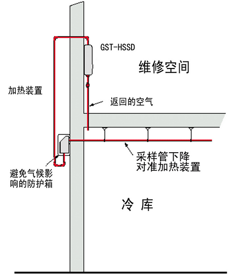 冷庫(kù)中采樣管,加熱箱和吸氣式感煙火災(zāi)探測(cè)器的相對(duì)位置