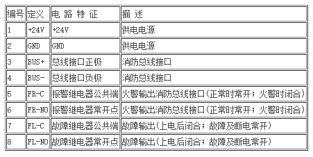 四.Flax52點型紅外火焰探測器接線方式;所有信號線和電源線宜采用截面積大于1.0mm的導線,并嚴格按規范要求進行布線,其中探測器外殼應良好接地。探測器接線定義見下表: