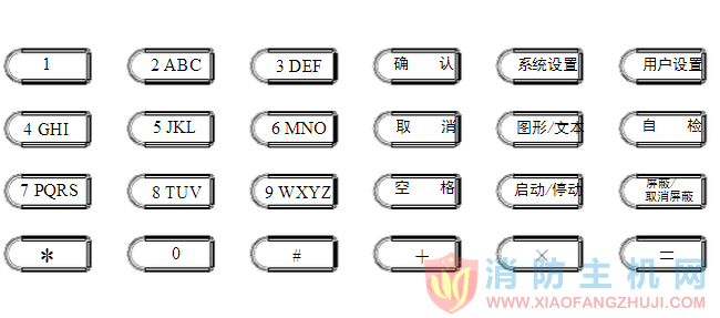 指用戶操作控制器時,完成相應的命令,改變系統狀態的按鍵,包 括:“火警確認”、“消音”、“警報器消音/啟動”、“火警傳輸直接控制”、“復位”、“自檢”、“啟動/停動”、“屏蔽/取消屏蔽”。  ? 設置功能類按鍵:指用戶需要設置控制器的參數、調試及改變控制器設置時使用的按 鍵,包括:“系統設置”、“用戶設置”。
